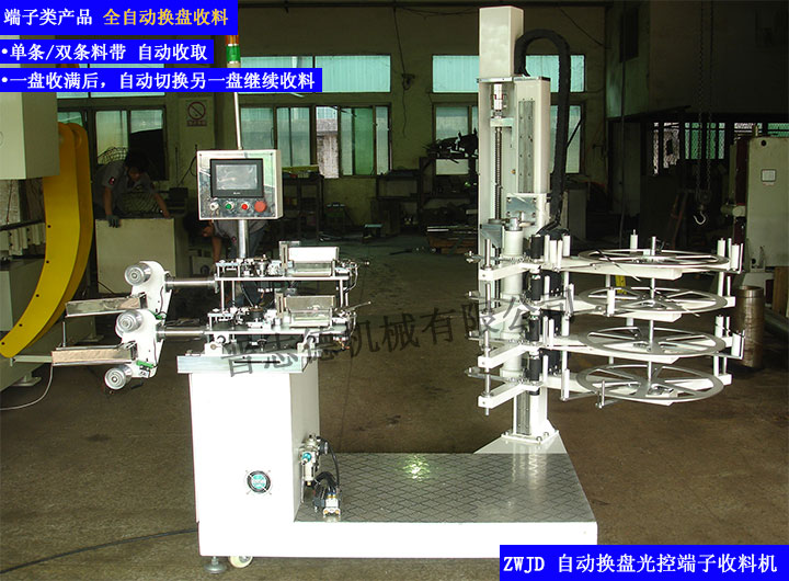 自動換盤端子收料機(jī)是專為高速沖床沖壓端子用單條式雙條料帶收取機(jī)。屬高端收料設(shè)備,其具有性能優(yōu)越,工作效率高,省時省力等優(yōu)點。當(dāng)一盤收滿時,會自動切換到另一盤繼續(xù)工作。中間不需停機(jī),是當(dāng)前先進(jìn)的自動化收料設(shè)備。