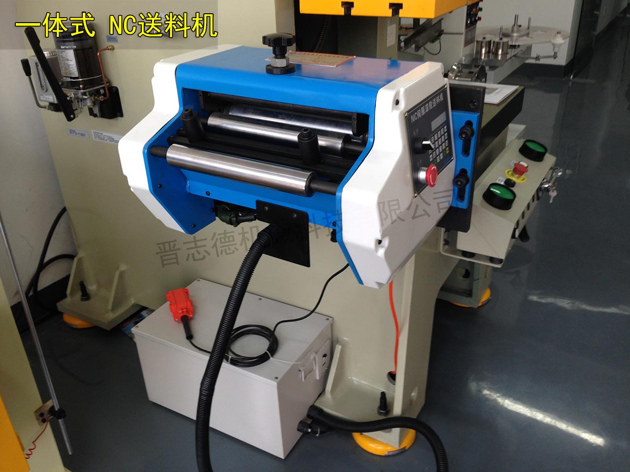 為了解決上述問題,晉志德機械專為3C精密制造行業客戶設計了一款機頭、電控一體式NC送料機,其將送料機機頭及電控箱組合為一體(PLC、伺服馬達與驅動器均為三菱公司為晉志德機械量身定制,集成電路板形式),當使用者于操控電控箱時,由于其是與送料機機頭組合為一體,因此使用者亦緊鄰送料機機頭而可隨時進行查看,因而參數設定較為準確,操作性較好,使其能與沖床達到優質的配合。