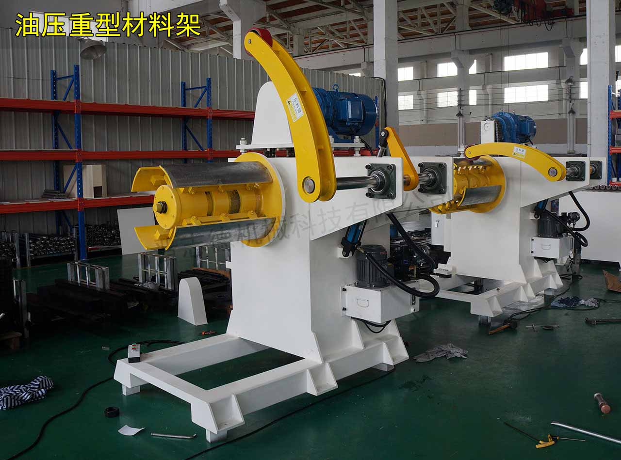 油壓重型材料架是專門針對寬料、重料而研發制造的機型,其將標準型重型材料架的手搖漲縮方式改為油壓漲縮方式,剎車由普通剎車改為分離式碟剎,同時變頻器、壓料臂的添加,以及主軸、機體的加固,使得油壓重型材料架能夠用于大型寬料、大噸位重料的放料與開卷,目前晉志德油壓重型材料架載重量可訂制20噸,料寬可訂制1800毫米。